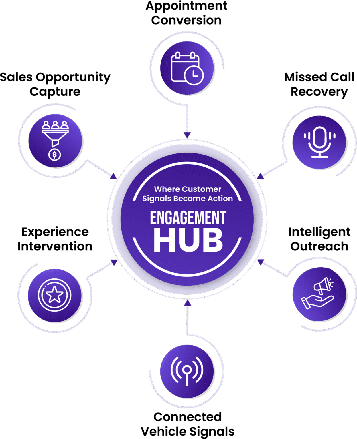 Engagement Hub unifies service conversations, AI agents, and workflows into one coordinated environment, capturing demand, prioritizing intent, and automatically routing, booking, or escalating the next best action. Instead of adding another inbox or point solution, Engagement Hub sits above the service tech stack to help Fixed Ops teams respond faster, reduce friction, and operate at scale without adding staff.